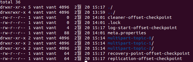 또한 도커 컴포즈에 볼륨 마운트 했던 /data/kafka/topics 밑을 보면