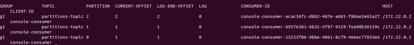 그룹을 g1으로만 3개 열었을 때 각각 컨슈머가 어느 파티션에 할당되어 있는지와 offset이 어디까지 읽었는지 확인할 수 있다.