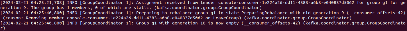 docker logs -f kafka 로 보고있으면, 컨슈머가 추가되었을 때