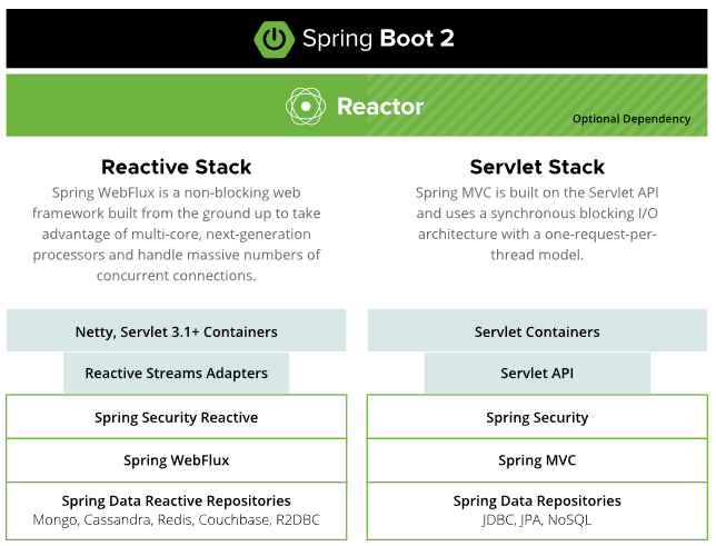 3. Reactive Stack의 서블릿은 Netty와 Tomcat 다 가능하며, Servlet Stack에서는 주로 Tomcat이 사용된다.